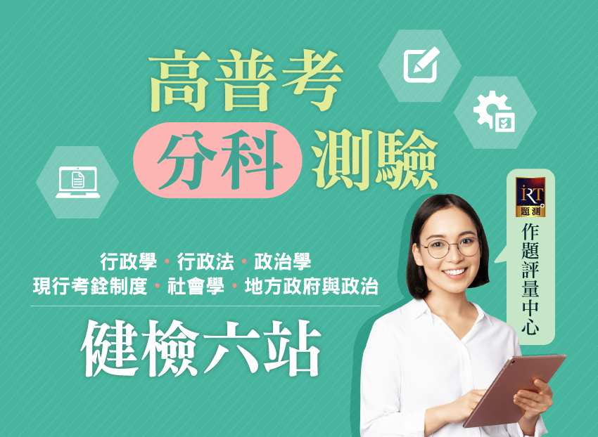 ※本系列測驗,由高點與IRT作題評量中心共同合作 一般行政 ‧ 人事行政 ‧ 一般民政 ‧ 法律廉政 情報 讀書會 榜首親輔指導 1熱議時事點評。 2解讀延伸考點。 練題 狂作題 考前30天 1模擬套卷仿真演練。 2申論寫作指導。 評量 IRT檢測 實境會考 1含總分、平均、名次、高低標。 2提供:關鍵知識點分析圖表。 3專業科目申論題批閱改正。 錦囊 問答總複習 真題快問快答 1關鍵考點講解。 2互動研討總題檢。
